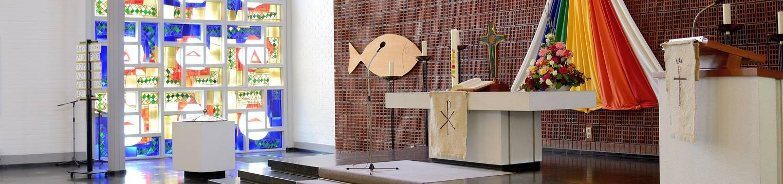 Drei Kreuze - fein angedeutet in dunklem Blau: Sie erinnern an Golgatha – den Ort des Todes, an dem neues Leben von Gott seinen vorösterlichen Ursprung hat. Durch das Kreuz Christi wird das Wort „Ich mache alles neu“! zu einem Verheißungswort, das Gottes Treue und unser irdisches Sein einbezieht.