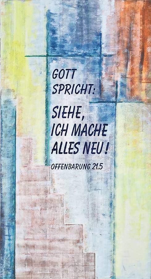 Sie nehmen zusammen mit den wenigen erkennbaren Strukturen im Bild von Alexander Ringwald die Spannung von Ewigkeit und Vergänglichkeit, von alt und neu, von Verwandlung und Treue auf - und führen sie zu einem „Dreiklang“ zusammen, zu drei biblischen Zusagen Gottes, die zusammengehören.